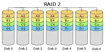 | RAID 2 | Bit-level striping with Hamming code for error correction | 3 | 1 − 1/n log2 (n + 1) | One drive failure[lower-alpha 4] | Drive Firmware and Parity | Depends | Depends |