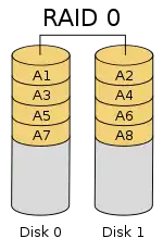 RAID 0 (also known as a stripe set or striped volume) splits ("stripes") data evenly across two or more disks, without parity information, redundancy, or fault tolerance. Since RAID 0 provides no fault tolerance or redundancy, the failure of one drive will cause the entire array to fail, due to data being striped across all disks. This configuration is typically implemented having speed as the intended goal.[2][3] RAID 0 is normally used to increase performance, although it can also be used as a way to create a large logical volume out of two or more physical disks.[4]