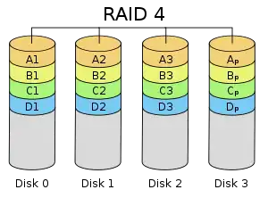 RAID 4 consists of block-level striping with a dedicated parity disk. As a result of its layout, RAID 4 provides good performance of random reads, while the performance of random writes is low due to the need to write all parity data to a single disk,[22] unless the filesystem is RAID-4-aware and compensates for that.