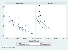 twoway (scatter mpg weight) (line mpghat weight, sort), by(foreign) // Graph data and fitted line