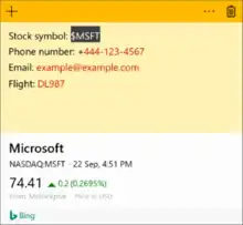 ![]() Screenshot of Sticky Notes on Windows 10 with insight enabled. The upper half with a yellow background is the typed note. Red text indicates an insight has been identified. The white with black highlight is the selected text for the insight shown in the lower portion of the sticky note. | |