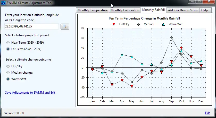 3) Select a climate change outcome to save to SWMM. There are three choices that span the range of outcomes produced by the different global climate models used in the CMIP3 project. The Hot/Dry outcome represents a model whose average temperature change was on the high end and whose average rainfall change was on the lower end of all model projections. The Warm/Wet outcome represents a model whose average temperature change was on the lower end and whose average rainfall change was on the wetter end of the spectrum. The Median outcome is for a model whose temperature and rainfall changes were closest to the median of all models.