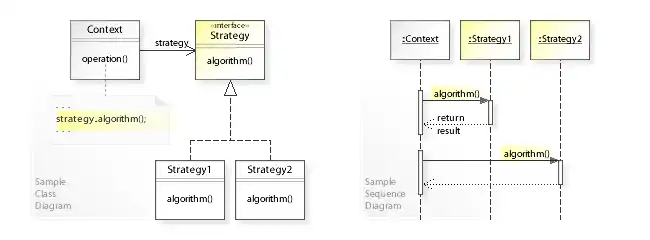 shows the runtime interactions: The Context object delegates an algorithm to different Strategy objects. First, Context calls algorithm() on a Strategy1 object,
