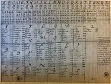 The work of Al-Qalqashandi (1355-1418), based on the earlier work of Ibn al-Durayhim (1312–1359), contained the first published discussion of the substitution and transposition of ciphers, as well as the first description of a polyalphabetic cipher, in which each plaintext letter is assigned more than one substitute.[7] Polyalphabetic substitution ciphers were later described in 1467 by Leone Battista Alberti in the form of disks. Johannes Trithemius, in his book Steganographia (Ancient Greek for "hidden writing") introduced the now more standard form of a tableau (see below; ca. 1500 but not published until much later). A more sophisticated version using mixed alphabets was described in 1563 by Giovanni Battista della Porta in his book, De Furtivis Literarum Notis (Latin for "On concealed characters in writing").