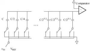 - The actual conversion process proceeds. First, the MSB capacitor is switched to Vref, which corresponds to the full-scale range of the ADC. Due to the binary-weighting of the array, the MSB capacitor forms a 1:1 charge divider with the rest of the array. Thus, the input voltage to the comparator is now −Vin + Vref⁄2 . Subsequently, if Vin is greater than Vref⁄2, then the comparator outputs a digital 1 as the MSB, otherwise it outputs a digital 0 as the MSB. Each capacitor is tested in the same manner until the comparator input voltage converges to the offset voltage, or at least as close as possible given the resolution of the DAC.