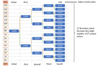 Example 2: The working of a 4-bit successive approximation ADC is illustrated below. The MSB is initially set to 1 whereas the remaining digits are set to zero. If the input voltage is lower than the value stored in the register, on the next clock cycle, the register changes its value to that illustrated in the figure by following the green line. If the input voltage is higher, then on the next clock cycle, the register changes its value to that illustrated in the figure by following the red line. The simplified structure of this type of ADC that acts on 2n volts range can be expressed as an algorithm: