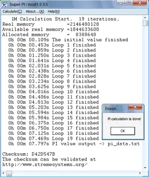 Super PI is popular in the overclocking community, both as a benchmark to test the performance of these systems[1][2] and as a stress test to check that they are still functioning correctly.[3]