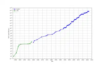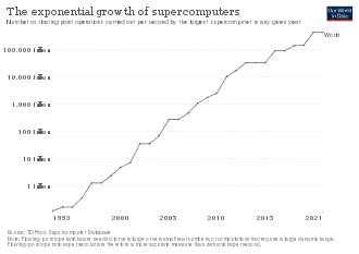 A supercomputer is a type of computer with a high level of performance as compared to a general-purpose computer. The performance of a supercomputer is commonly measured in floating-point operations per second (FLOPS) instead of million instructions per second (MIPS). Since 2017, supercomputers have existed which can perform over 1017 FLOPS (a hundred quadrillion FLOPS, 100 petaFLOPS or 100 PFLOPS).[3] For comparison, a desktop computer has performance in the range of hundreds of gigaFLOPS (1011) to tens of teraFLOPS (1013).[4][5] Since November 2017, all of the world's fastest 500 supercomputers run on Linux-based operating systems.[6] Additional research is being conducted in the United States, the European Union, Taiwan, Japan, and China to build faster, more powerful and technologically superior exascale supercomputers.[7]