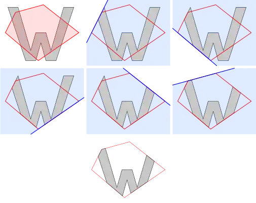 The Sutherland–Hodgman algorithm is an algorithm used for clipping polygons. It works by extending each line of the convex clip polygon in turn and selecting only vertices from the subject polygon that are on the visible side.