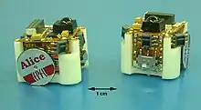 | Alice | distance, camera | wheel, 4 cm/s | 2.2 cm | 10 h | École Polytechnique Fédérale de Lausanne (EPFL), Switzerland | Alice is a swarm robotic platform built in a very small package size. Alice has been used in many swarm research applications such as the embodiment of cockroach aggregation.[8] | ![]() The Alice microrobot | ||