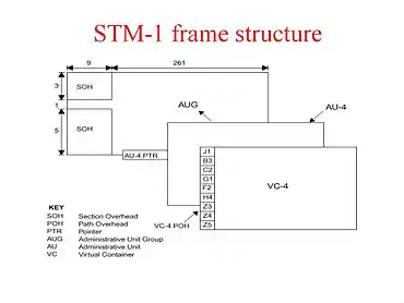 The Synchronous Transport Module, level 1 (STM-1) frame is the basic transmission format for SDH—the first level of the synchronous digital hierarchy. The STM-1 frame is transmitted in exactly 125 μs, therefore, there are 8,000 frames per second on a 155.52 Mbit/s OC-3 fiber-optic circuit.[nb 1] The STM-1 frame consists of overhead and pointers plus information payload. The first nine columns of each frame make up the section overhead and administrative unit pointers, and the last 261 columns make up the information payload. The pointers (H1, H2, H3 bytes) identify administrative units (AU) within the information payload. Thus, an OC-3 circuit can carry 150.336 Mbit/s of payload, after accounting for the overhead.[nb 2]