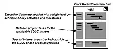 To manage and control a substantial SDLC initiative, a work breakdown structure (WBS) captures and schedules the work. The WBS and all programmatic material should be kept in the "project description" section of the project notebook. The project manager chooses a WBS format that best describes the project.