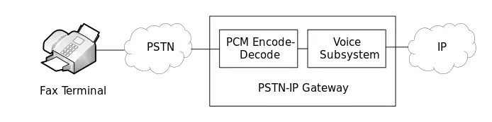 As shown in the diagram below, a T.38 gateway is composed of two primary elements: the fax modems and the T.38 subsystem. The fax modems modulate and demodulate the PCM samples of the analog data, turning the sampled-data representation of the fax terminal's analog signal to its binary translation, and vice versa. The PSTN network samples the analog signal of a voice or modem signal (it doesn't know the difference) 8,000 times per second (SPS), and encodes them as 8-bit data bytes. This means 8000 samples-per-second times 8-bits per sample, or 64,000 bits per second (bit/s) to represent the modem (or voice) data in one direction. For both directions the modem transaction consumes 128,000 bits of network bandwidth.