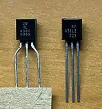 The TL431 integrated circuit (IC) is a three-terminal adjustable precise shunt voltage regulator. With the use of an external voltage divider, a TL431 can regulate voltages ranging from 2.495 to 36 V, at currents up 100 mA. The typical initial deviation of reference voltage from the nominal 2.495 V level is measured in millivolts, the maximum worst-case deviation is measured in tens of millivolts. The circuit can control power transistors directly; combinations of the TL431 with power MOS transistors are used in high efficiency, very low dropout linear regulators. The TL431 is the de facto industry standard error amplifier circuit for switched-mode power supplies with optoelectronic coupling of the input and output networks.[1][2][3]