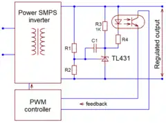 In the 21st century, the TL431, loaded with an optocoupler's light-emitting diode (LED), is the de facto industry standard solution for regulated switched-mode power supplies (SMPS).[1][2][3] A resistive voltage divider driving the control input of the TL431, and the LED's cathode are normally connected to the regulator's output; the optocoupler's phototransistor is connected to the control input of the pulse-width modulation (PWM) controller.[33] Resistor R3 (around 1 kΩ), shunting the LED, helps keep ICA above the 1 mA threshold.[33] In a typical power supply/charger supplied with a laptop computer, average ICA is set at around 1.5 mA, including a 0.5 mA LED current and a 1 mA shunt current (2012 data).[7]