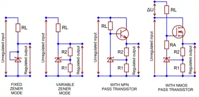 Adding an emitter follower converts a shunt regulator into a series regulator. Efficiency is mediocre because single npn-type transistors or Darlington pairs require fairly a high collector-emitter voltage drop.[28] A single common-emitter pnp-type transistor can operate correctly in saturation mode, with only ≈0.25 V voltage drop, but also with impractically high base currents.[29] A compound pnp-type transistor does not need as much drive current, but it requires at least a 1 V voltage drop.[29] An N-channel power MOSFET device enables the best combination of low drive current, very low dropout voltage, and stability.[29] However, low-dropout MOSFET operation requires an additional high-side voltage source (ΔU in schematic) for driving the gate.[29] ΔU can be obviated if a depletion mode MOSFET is used.