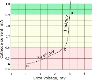 When VREF is safely below the 2.495 V threshold (point A on current-voltage curve), the output transistor is off. Residual cathode-anode current ICA, feeding the front-end circuit, stays within 100 and 200 μA.[9] When VREF approaches the threshold, the ICA rises to 300–500 μA, but the output transistor remains off.[9] Upon reaching its threshold (point B), the output transistor begins to conduct (turn on), and the ICA begins rising at a rate of around 30 mA/V.[9] When VREF exceeds the threshold by around 3 mV, and ICA reaches 500–600 μA (point C), transconductance sharply jumps to 1.0–1.4 A/V.[9] Above this point the TL431 operates in its normal, high transconductance mode and may be conveniently approximated with a differential voltage to single-ended current converter model.[1][9] The current rises until the negative feedback loop connecting the cathode with the control input stabilizes VREF at some point above the threshold. This point (Vref) is, strictly speaking, the reference voltage of the complete regulator.[7][3] Alternatively, the TL431 may operate without feedback as a voltage comparator, or with positive feedback as a Schmitt trigger; in such applications ICA is limited only by the anode load and the power supply capacity.[10]