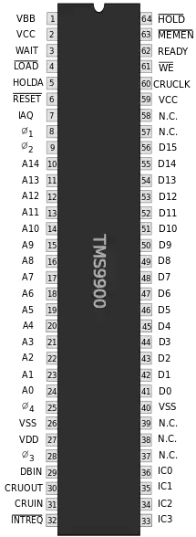 The chip was packaged in a (then unusual) 64-pin, 0.9" wide DIP. The comparatively large number of pins allowed for the 15-bit (word) address bus and 16-bit data bus to be brought out on dedicated pins without the use of multiplexing (unlike e.g. the Intel 8086 CPU), keeping external memory connections simple. Contrary to the convention used by many other manufacturers, TI labeled the most significant address and data lines "A0" and "D0", respectively. All internal data paths and the ALU are 16 bits wide.