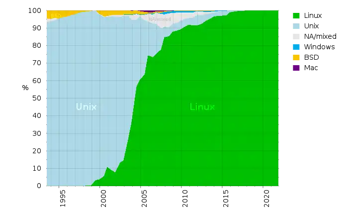 Since November 2015, no computer on the list runs Windows (while Microsoft reappeared on the list in 2021 with Ubuntu based on Linux). In November 2014, Windows Azure[15] cloud computer was no longer on the list of fastest supercomputers (its best rank was 165th in 2012), leaving the Shanghai Supercomputer Center's Magic Cube as the only Windows-based supercomputer on the list, until it also dropped off the list. It was ranked 436th in its last appearance on the list released in June 2015, while its best rank was 11th in 2008.[16] There are no longer any Mac OS computers on the list. It had at most five such systems at a time, one more than the Windows systems that came later, while the total performance share for Windows was higher. Their relative performance share of the whole list was however similar, and never high for either. In 2004, the System X supercomputer based on Mac OS X (Xserve, with 2,200 PowerPC 970 processors) once ranked 7th place.[17]