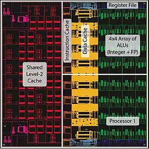 In 2003, the TRIPS team started implementing a prototype chip. Each chip has two complete cores, each one with 16 functional units in a four-wide, four-deep arrangement. In the current implementation, the compiler constructs "hyperblocks" of 128 instructions each, and allows the system to keep eight blocks "in flight" at the same time, for a total of 1,024 instructions per core. The basic design can include up to 32 chips interconnected, approaching 500 GFLOPS.[5]