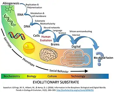 The article further argues that from the perspective of the evolution, several previous Major Transitions in Evolution have transformed life through innovations in information storage and replication (RNA, DNA, multicellularity, and culture and language). In the current stage of life's evolution, the carbon-based biosphere has generated a cognitive system (humans) capable of creating technology that will result in a comparable evolutionary transition.