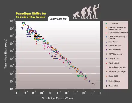 In addition to general criticisms of the singularity concept, several critics have raised issues with Kurzweil's iconic chart. One line of criticism is that a log-log chart of this nature is inherently biased toward a straight-line result. Others identify selection bias in the points that Kurzweil chooses to use. For example, biologist PZ Myers points out that many of the early evolutionary "events" were picked arbitrarily.[83] Kurzweil has rebutted this by charting evolutionary events from 15 neutral sources, and showing that they fit a straight line on a log-log chart. Kelly (2006) argues that the way the Kurzweil chart is constructed with x-axis having time before present, it always points to the singularity being "now", for any date on which one would construct such a chart, and shows this visually on Kurzweil's chart.[84]