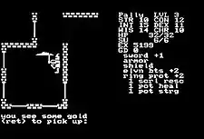 The single-player adventure begins by personalizing a player character. Each character has randomly generated values for their statistical character attributes: charisma, constitution, dexterity, intelligence, strength, and wisdom.[lower-alpha 2] The algorithm never changes, but the player can randomize repeatedly for new character attribute distributions until satisfied. The player begins with a sword, armor, shield, and no money, and can only see the immediate surroundings, rather than the whole level.[5]