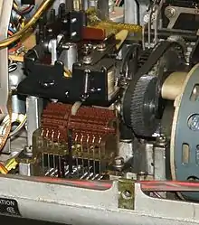 As a cost-saving measure, the optional paper tape mechanisms were dependent on the keyboard and page printer mechanisms. The interface between the paper tape reader and the rest of the terminal is completely mechanical, with power, clock, and eight data bits (which Teletype called "intelligence") all transmitted in parallel through metal levers. Configuration of user-selectable options (such as parity) is done with mechanical clips that depress or release various levers. Sensing of punched holes by the paper tape reader is done by using metal pins which mechanically probe for their presence or absence.[10] The paper tape reader and punch can handle eight-bit data, allowing the devices to be efficiently used to download or upload binary data for computers.[9]