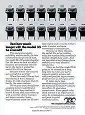 The Teletype Model 33 is an electromechanical teleprinter designed for light-duty office use. It is less rugged and cost less than earlier Teletype models. The Teletype Corporation introduced the Model 33 as a commercial product in 1963,[1] after it had originally been designed for the United States Navy.[2] The Model 33 was produced in three versions:[3]
