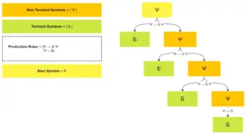 Here Б is a terminal symbol because no rule exists which would change it into something else. On the other hand, Ψ has two rules that can change it, thus it is nonterminal. A formal language defined or generated by a particular grammar is the set of strings that can be produced by the grammar and that consist only of terminal symbols. Diagram 1 illustrates a string that can be produced with this grammar.
