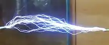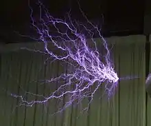 The above peak voltage is only achieved in coils in which air discharges do not occur; in coils which produce sparks, like entertainment coils, the peak voltage on the terminal is limited to the voltage at which the air breaks down and becomes conductive.[10][15][17] As the output voltage increases during each voltage pulse, it reaches the point where the air next to the high-voltage terminal ionizes and corona, brush discharges, and streamer arcs break out from the terminal. This happens when the electric field strength exceeds the dielectric strength of the air, about 30 kV per centimeter. Since the electric field is greatest at sharp points and edges, air discharges start at these points on the high-voltage terminal. The voltage on the high-voltage terminal cannot increase above the air breakdown voltage, because additional electric charge pumped into the terminal from the secondary winding just escapes into the air. The output voltage of open-air Tesla coils is limited to a few million volts by air breakdown,[6] but higher voltages can be achieved by coils immersed in pressurized tanks of insulating oil.