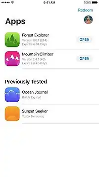 TestFlight is an online service for over-the-air installation and testing of mobile applications, currently owned by Apple Inc. and only offered to developers within the iOS Developer Program.[2][3][4] Developers sign up with the service to distribute applications to internal or external beta testers, who can subsequently send feedback about the application to developers.[4][5][6] The TestFlight SDK additionally allows developers to receive remote logs, crash reports and tester feedback.[7]