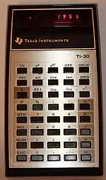 In 1973, the handheld calculator SR-10 (named after slide rule) and in 1974, the handheld scientific calculator SR-50 were issued by TI. Both had red LED-segments numeric displays. The optical design of the SR-50 is somewhat similar to the HP-35 edited by Hewlett-Packard before in early 1972, but buttons for the operations "+", "–", ... are in the right of the number block and the decimal point lies between two neighboring digits.