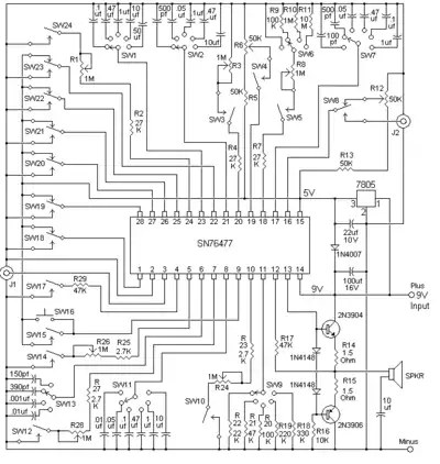 - SW1 is a five position rotary switch that selects which capacitor controls the one-shot circuit that sets the envelope timing.