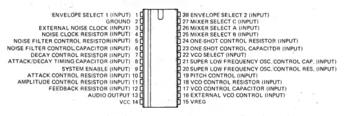 [T]he SN76477 generates complex audio signal waveforms by combining the outputs of a low frequency oscillator, variable frequency (voltage controlled) oscillator (VCO) and noise source, modulating the resulting composite signal with a selected envelope and, finally, adjusting the signal's attack and decay periods. At each stage, the process can be controlled at the programming inputs of the signal modification and generation circuits, using control voltages, logic levels, or different resistor and capacitor values.