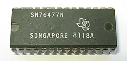 SN76477 "complex sound generator" is a sound chip produced by Texas Instruments (TI). The chip came to market in 1978,[1] and TI ceased production of the part. A compatible version is identified as ICS76477.[2] The chip is typically used as a sound effects generator in arcade games and toys and for hobby projects. The use of the SN76477 in a musical context is limited by the fact that it was difficult to electronically control the pitch of the produced sound.[3]