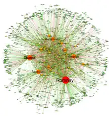 The automatic parsing of textual corpora has enabled the extraction of actors and their relational networks on a vast scale, turning textual data into network data. The resulting networks, which can contain thousands of nodes, are then analyzed by using tools from network theory to identify the key actors, the key communities or parties, and general properties such as robustness or structural stability of the overall network, or centrality of certain nodes.[44] This automates the approach introduced by quantitative narrative analysis,[45] whereby subject-verb-object triplets are identified with pairs of actors linked by an action, or pairs formed by actor-object.[43]