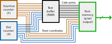 ![]() A sample of character box and corresponding electronic scheme. The glyph is 8×8 pixels, with 3-bit low parts of scan line and dot counter. The screen is between 20×18 and 32×32 character cells, with 5-bit indices. | |||||||||||