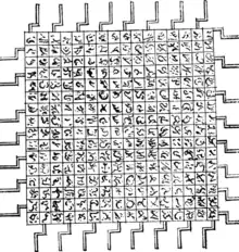 “... Every one knew how laborious the usual method is of attaining to arts and sciences; whereas, by his contrivance, the most ignorant person, at a reasonable charge, and with a little bodily labour, might write books in philosophy, poetry, politics, laws, mathematics, and theology, without the least assistance from genius or study.” He then led me to the frame, about the sides, whereof all his pupils stood in ranks. It was twenty feet square, placed in the middle of the room. The superfices was composed of several bits of wood, about the bigness of a die, but some larger than others. They were all linked together by slender wires. These bits of wood were covered, on every square, with paper pasted on them; and on these papers were written all the words of their language, in their several moods, tenses, and declensions; but without any order. The professor then desired me “to observe; for he was going to set his engine at work.” The pupils, at his command, took each of them hold of an iron handle, whereof there were forty fixed round the edges of the frame; and giving them a sudden turn, the whole disposition of the words was entirely changed. He then commanded six-and-thirty of the lads, to read the several lines softly, as they appeared upon the frame; and where they found three or four words together that might make part of a sentence, they dictated to the four remaining boys, who were scribes. This work was repeated three or four times, and at every turn, the engine was so contrived, that the words shifted into new places, as the square bits of wood moved upside down."[2]