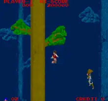 The player takes the role of a young Iga ninja named Kage ("Shadow"), on a mission to rescue Princess Kiri (hime) - the Shogun's daughter - from the villainous warlord Yoshi (ro Kuyigusa) and fellow evil samurai Yuki (nosuke Riko). The player is armed with a kodachi shortsword and an unlimited number of shuriken.[6] Kage must fight his way through a forest, along a secret passageway, up a fortress wall, and through a castle, rescuing her twice (three times in the FC/NES version) in order to win the game.[6] Each time the princess is rescued, the seasons change from summer to fall to winter and back to summer.[6][7]