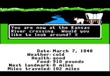 In between landmarks, the party journeys for days over a hundred miles, as shown to the player by a screen that displays the date, weather, health of the party, how many pounds of food the party has remaining, and the distances to the next landmark and from the previous. An animated ox-pulled wagon is shown, with a representation of the next landmark sliding towards it from the left as the party travels and a landscape of the terrain for that segment in the background. Random events can occur during the traveling phase, such as a storm causing a delay or a party member falling ill.[4] The player can also stop the journey at any point, and can then check the status of their supplies, look at the map of their journey, change the pace of travel, change the amount of food rationed for the party per day, stop to rest, trade with other parties for supplies, or hunt for food. Changing the pace of travel affects how long each segment takes and also the likelihood of different events, such as oxen going lame, and changing the food rations similarly affects how quickly food supplies are used and the likelihood of events.
