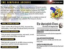 The Simpsons Archive, also known by its previous domain name snpp.com or simply SNPP (named for the Springfield Nuclear Power Plant), is a Simpsons fan site that has been online since 1994. Maintained by dozens of volunteers from—amongst other places—the newsgroup alt.tv.simpsons and Simpsons-related forums, the site features information on every aspect of the show, from detailed guides to upcoming episodes and merchandise, to the episode capsules (text files documenting freeze frame jokes, quotes, scene summaries, reviews and the like), for which the site is well known. In a bid to steer clear of Fox's legal department after a conflict in 1996, the site contains no multimedia or interactive features, preferring to focus on documenting the show through textual material.[1] As of October, 2005, the site receives roughly 1.2 million hits per month. In December, 2013, it was moved to simpsonsarchive.com, with the original snpp.com domain returned to the owner that had provided it to the project at no cost since 1995.[2]