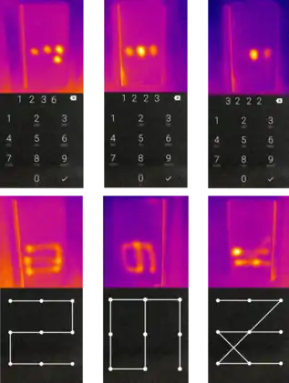 A thermal attack (aka thermal imaging attack) is an approach that exploits heat traces to uncover the entered credentials. These attacks rely on the phenomenon of heat transfer from one object to another. During authentication, heat transfers from the users' hands to the surface they are interacting with, leaving heat traces behind that can be analyzed using thermal cameras that operate in the far-infrared spectrum. These traces can be recovered and used to reconstruct the passwords.[1][2] In some cases, the attack can be successful even 30 seconds after the user has authenticated.[1]