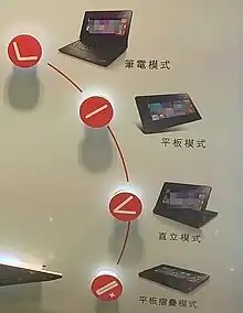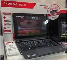 The Helix serves as a conventional notebook computer but uses a "rip and flip" design that allows the user to detach the display and then replace it facing in a different direction. Also, as all essential processing hardware is contained in the display assembly and it has multitouch capability, the monitor can be used as a standalone tablet computer. The Helix features include Gorilla Glass, stylus-based input, and Intel vPro hardware-based security features, and is designed to appeal to business users.[3] The Helix makes use of a refined version of the ThinkPad trackpoint. The five mechanical buttons featured on most ThinkPad trackpoints have been replaced with a fixed glass touchpad.[4] The included pressure-sensitive stylus is from Wacom and fits into a dedicated slot in the tablet portion of the device.[4]