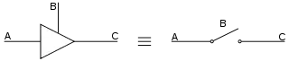 In digital electronics, a tri-state or three-state buffer is a type of digital buffer that has three stable states: a high output state, a low output state, and a high-impedance state. In the high-impedance state, the output of the buffer is disconnected from the output bus, allowing other devices to drive the bus without interference from the tri-state buffer. This can be useful in situations where multiple devices are connected to the same bus and need to take turns accessing it. Systems implementing three-state logic on their bus are known as a three-state bus or tri-state bus.