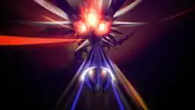 The objective of Thumper is to guide a beetle-like creature along a single or multi-track through a series of unnerving worlds.[1] The player must press a button to hit lit "notes" on the track in time with the background music, while also bracing against obstacles, turning against curved walls, jumping over spikes, and defeating enemies. The game is played in a third-person point of view with an extremely fast scrolling speed.
