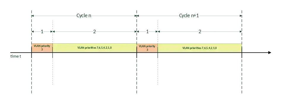 In this example, each cycle consists of two time slices. Time slice 1 only allows the transmission of traffic tagged with VLAN priority 3, and time slice 2 in each cycle allows for the rest of the priorities to be sent. Since the IEEE 802.1Qbv scheduler requires all clocks on all network devices (Ethernet switches and end devices) to be synchronized and the identical schedule to be configured, all devices understand which priority can be sent to the network at any given point in time. Since time slice 2 has more than one priority assigned to it, within this time slice, the priorities are handled according to standard IEEE 802.1Q strict priority scheduling.