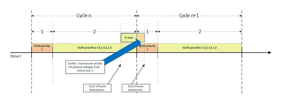 Just before the end of time slice 2 in cycle n, a new frame transmission is started. Unfortunately, this frame is too large to fit into its time slice. Since the transmission of this frame cannot be interrupted, the frame infringes the following time slice 1 of the next cycle n+1. By partially or completely blocking a time-critical time slice, real-time frames can be delayed up to the point where they cannot meet the application requirements any longer. This is very similar to the actual buffering effects that happen in non-TSN Ethernet switches, so TSN has to specify a mechanism to prevent this from happening.