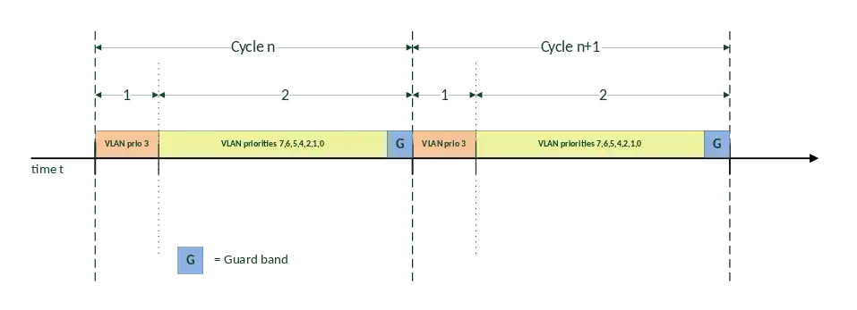 In this example, the time slice 1 always contains high priority data (e.g. for motion control), while time slice 2 always contains best-effort data. Therefore, a guard band needs to be placed at every transition point into time slice 1 to protect the time slice of the critical data stream(s).
