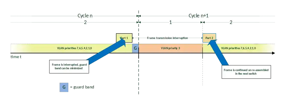 Figure 4 gives a basic example how frame pre-emption works. During the process of sending a best effort Ethernet frame, the MAC interrupts the frame transmission just before the start of the guard band. The partial frame is completed with a CRC and will be stored in the next switch to wait for the second part of the frame to arrive. After the high priority traffic in time slice 1 has passed and the cycle switches back to time slice 2, the interrupted frame transmission is resumed. Frame pre-emption always operates on a pure link-by-link basis and only fragments from one Ethernet switch to the next Ethernet switch, where the frame is reassembled. In contrast to fragmentation with the Internet Protocol (IP), no end-to-end fragmentation is supported.